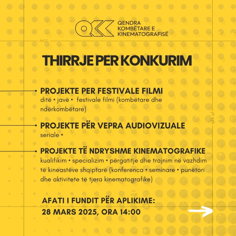 Qendra Kombëtare e Kinematografisë fton të gjithë kineastët, producentët dhe shtëpitë kinematografike të aplikojnë për projekte në këto kategori: •…