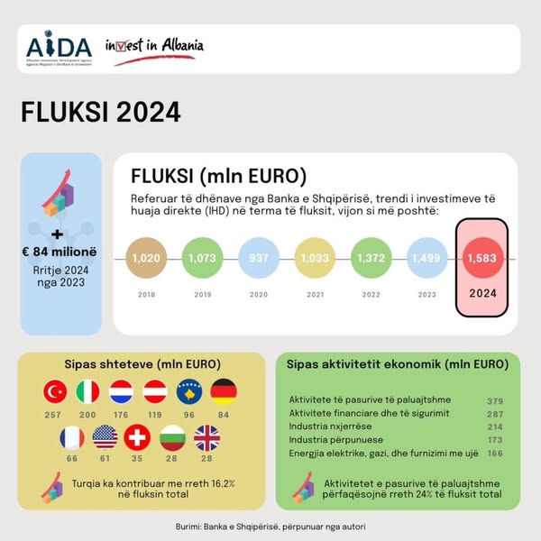Fluksi i investimeve të huaja direkte në vitin 2024 ka arritur €1.6 miliardë, një shifër rekord! Krahasuar me vitin 2023,…