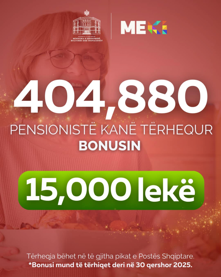 – 404,880 pensionistë që marrin pension nën 20,000 lekë, pensionistët e invaliditetit dhe ata me pensione familjare, kanë tërhequr bonusin prej 15,000 lekë.