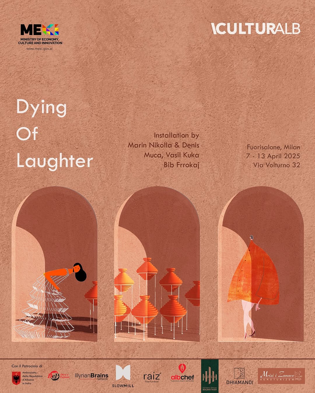 Nga data 8 deri më 13 prill 2025, u prezantua instalacioni Dying of Laughter (Duke vdekur së qeshuri) me autor Marin Nikolla dhe Denis Muça të cilët përfaqësuan Shqipërinë në Fuori Salone në Milano. Ky instalacion ndërthur marrëdhënien komplekse mes kujtesës kolektive dhe mjeshtërisë artizanale të qeramikës mes giuhes dhe materialitetit. Paralelisht, ne Slow Mill u zhvillua nje program një program shoqërues me aktivitete perfshirë: diskutime, performanca artistike dhe degustime kulturore dhe gastronomike.