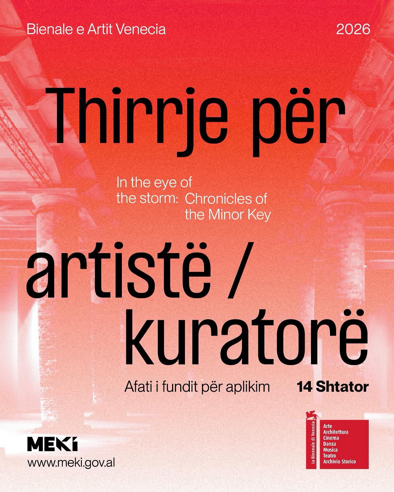Në kuadrin e Bienales së ardhshme Ndërkombëtare të Artit në Venecia, Ministria e Ekonomisë, Kulturës dhe Inovacionit në cilësinë e komisionerit të Pavijonit Shqiptar, shpall thirrjen për paraqitjen e projektit për Pavijonin Shqiptar në Bienalen e Artit, që do të jetë e hapur për publikun në periudhën 09 maj – 22 nëntor 2026 (para-hapje 6, 7 dhe 8 maj) në Giardini, Arsenale dhe vende të tjera në Venecia, me temë: In Minor Keys, nga kuratorja Koyo Kouoh.