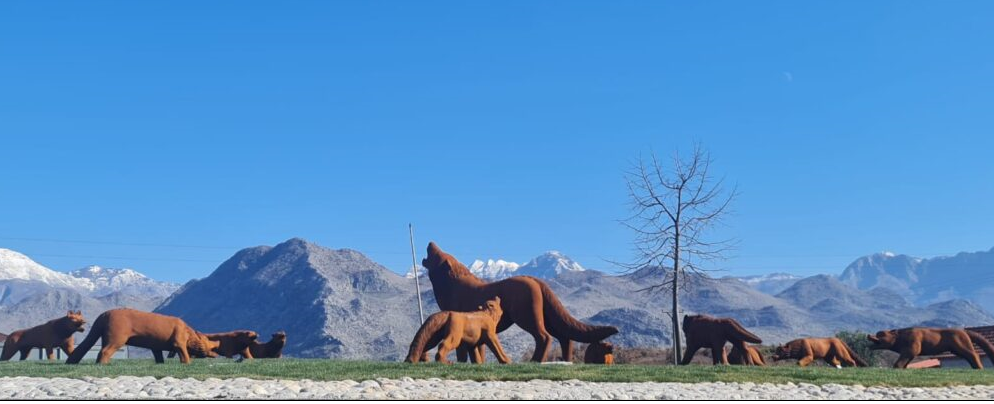 Vepra e artit “Wolves Coming”, e artistit kinez me famë botërore Liu Rouwang, simbolizon reagimin e natyrës ndaj agresionit njerëzor dhe thirrjen “ulëritëse” për ta mbrojtur diversitetin. Ndaj realizimit të kësaj vepre sot, ne jemi të ekspozuar ndaj një mjedisi më të rrezikshëm se i paraardhësve që përplasen me ujqër në adjerrinë duke u përballur me shpejtësi burimet natyrore shterojnë, degradojnë mjedisi dhe dëshirat e pafundme lakmitare dhe ambiciet. Luftëtari që lufton me ujqërit duket i paaftë dhe i papërfillshëm. Vepra qëndron mbi sistematizimin e mjedisit me gjelbërim dhe gurë, nga ku është janë mbjellur pemë zbukuruese.